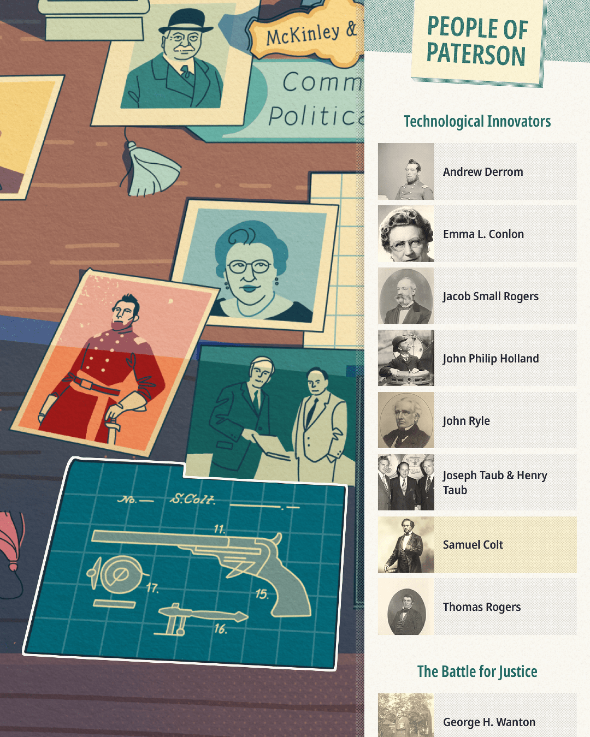 The touchscreen experience is designed to connect to the physical exhibits in the museum. A visitor might learn about Samuel Colt and his development of the iconic Colt pistol through the mural, then encounter real artifacts of that invention elsewhere in the gallery. In this way, People of Paterson acts as a guide to the Paterson Museum in addition to a standalone experience.
